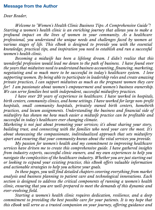 Optimize your women’s health clinic with this comprehensive 127-page eBook, designed specifically for midwives, nurse practitioners, physician assistants, and physicians who want to deliver high-quality care while running a smooth, sustainable, and financially healthy clinic.